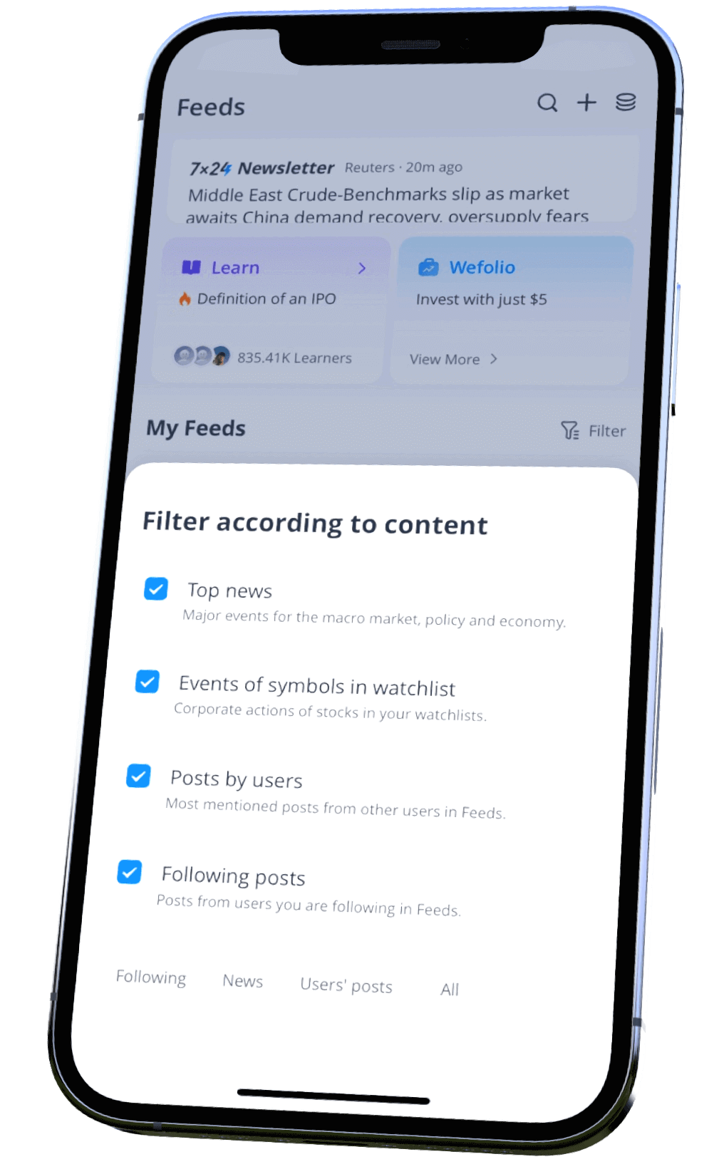 Stay up-to-date with current market trends with feeds, news, events, and posts about the markets. Customizable filters allow you to focus on certain content or category!