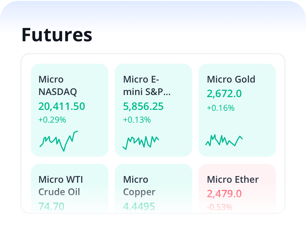 Leverage futures trading on Webull to diversify your portfolio with low-cost, seamless access. Trade a variety of contracts, including commodities, equity indices, and crypto, with extended hours and low intraday margins. Enjoy competitive commissions and transparent pricing with no hidden fees.